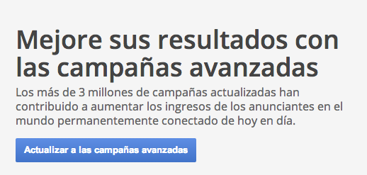 Soy de las que me ha tocado estrenar las Campañas Avanzadas, y a su vez actualizar campañas configuradas hace tiempo, que me están funcionando tan bien que en lugar de establecer fecha de finalización las tengo paralizadas hasta nuevo aviso del cliente. No obstante, no me he librado de tener que actualizarlas, lo que ha supuesto simplemente la inclusión de una serie de parámetros nuevos. Eso sí, siempre dirigidos a dispositivos móviles y todo lo que ello conlleva.